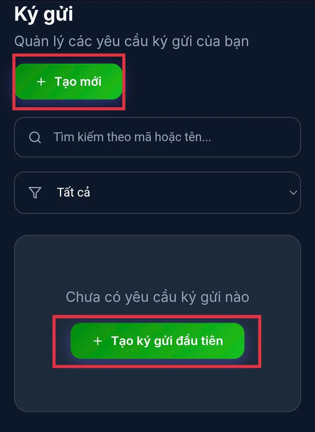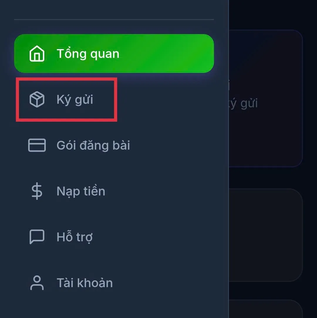 Bước 3: Tại giao diện ký gửi bạn chọn vào biểu tượng ba gạch ngang phía trên, bên trái, chọn mục “Ký gửi” và chọn “Tạo mới”.