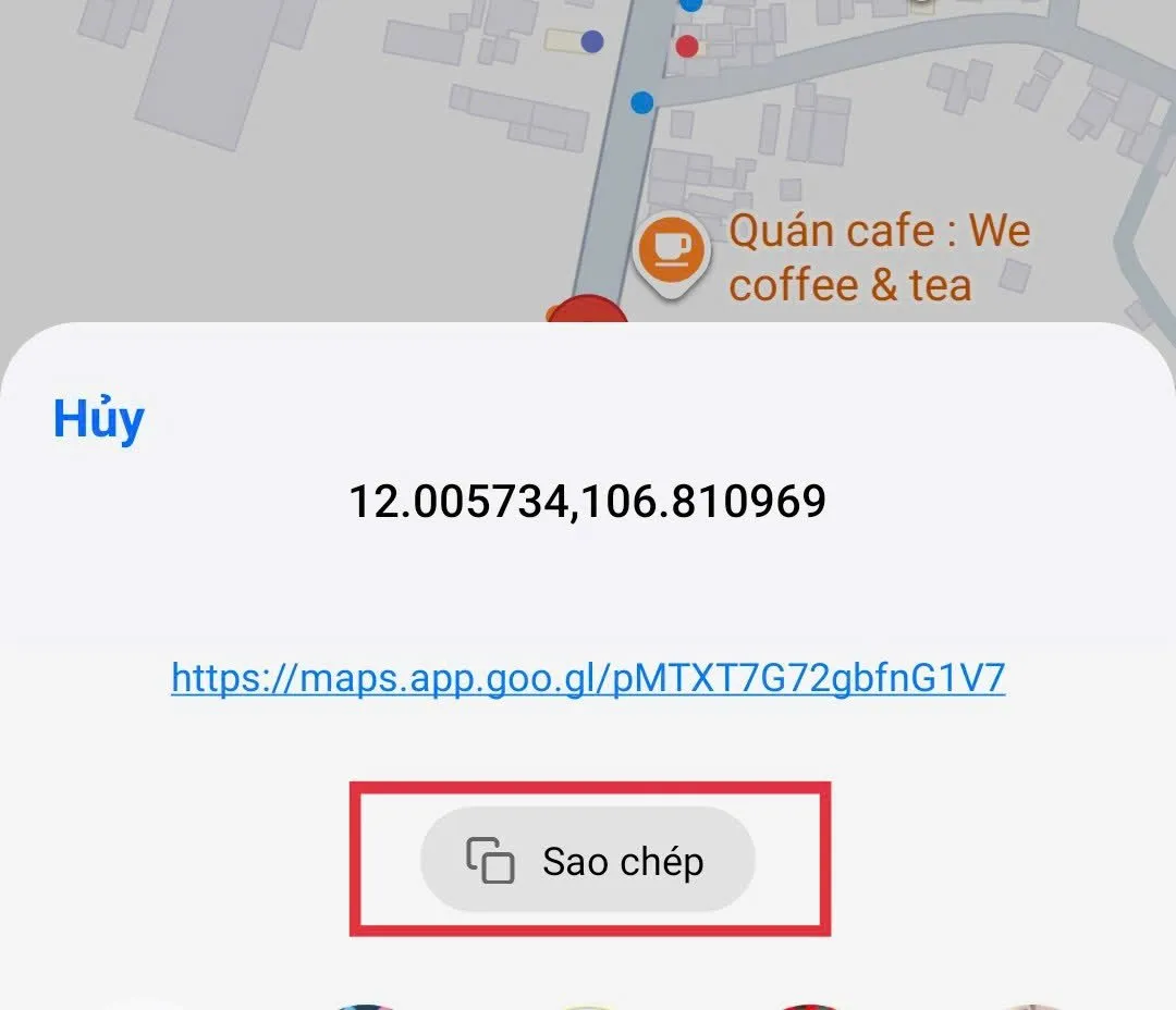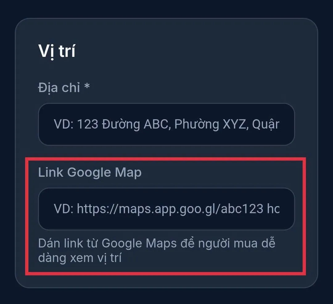 Bước 4: Nhập các thông tin cần thiết theo yêu cầu, tại mỗi mục đã có nội dung gợi ý. Riêng nội dunng “Link Google Map” tại mục “Vị trí”, bạn nhập bằng cách copy link vị trí của bất động sản cần bán sau đó dán link vào bài đăng. Để copy được link vị trí, bạn vào ứng dụng “Maps”, tại vị trí của bất động sản cần bán chọn mục “Chia sẻ” , bấm vào biểu tượng sao chép như vậy bạn đã có link vị trí.
